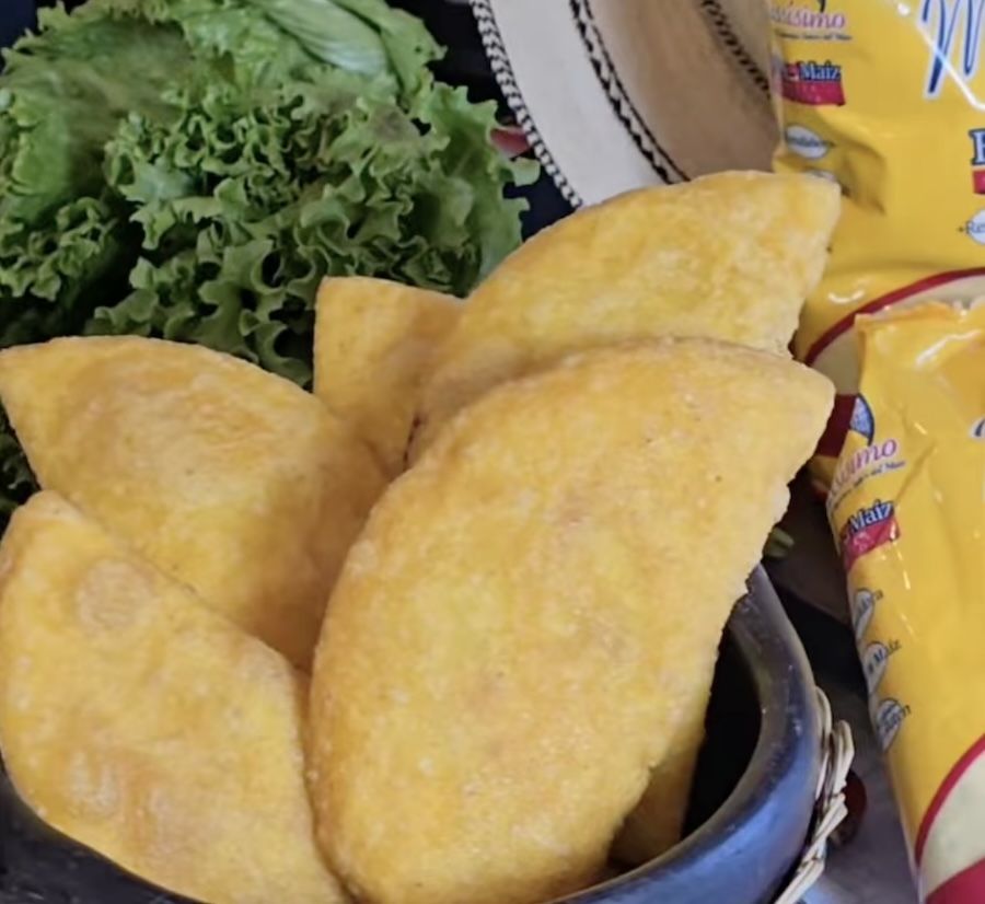- Para la masa en un recipiente vierte el agua tibia con sal al gusto, luego añade el aceite de achiote. Una vez integrados los líquidos procede a verter poco a poco la harina de maíz amarilla Maissísimo, revuelva hasta crear una masa consistente. Si es necesario le añade más harina hasta crear una masa apta para hacer discos de aproximadamente 10 cm. para empanadas. Deja reposar la masa hasta que haga el sofrito de tasajo.